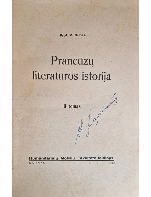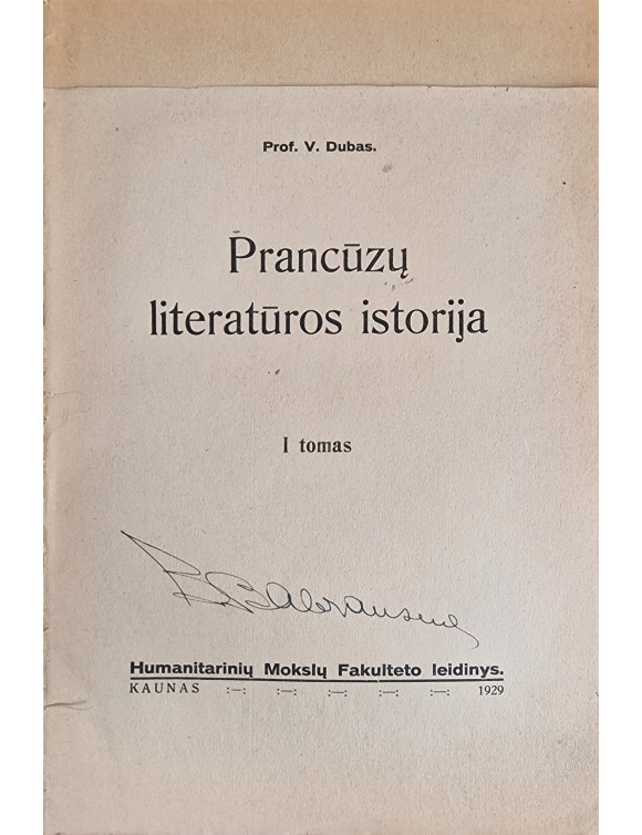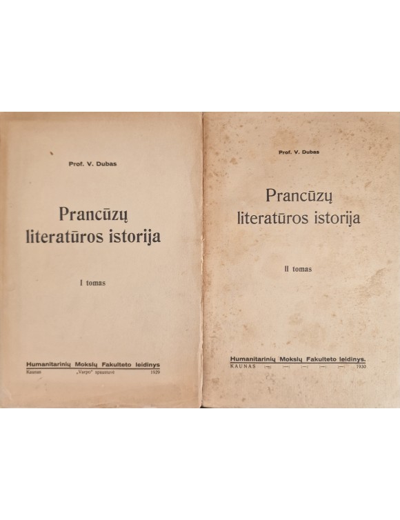 Prancūzų literatūros istorija. V. Dubas. T. 1-2. Kaunas, 1929-1930.
