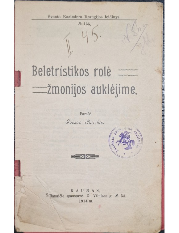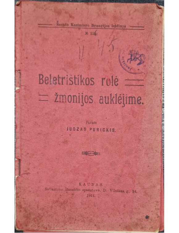 Beletristikos rolė žmonijos auklėjime. J. Purickis. Kaunas, 1914.