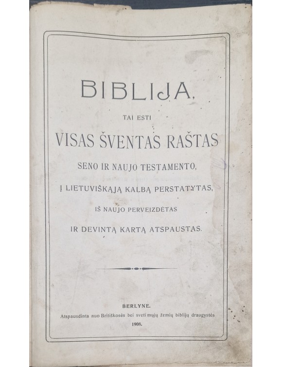 Biblija, tai esti visas Šventas raštas seno ir naujo testamento, į Lietuviškąją kalbą perstatytas, iš naujo perveizdėtas ir devintą kartą atspaustas. Berlynas, 1908.