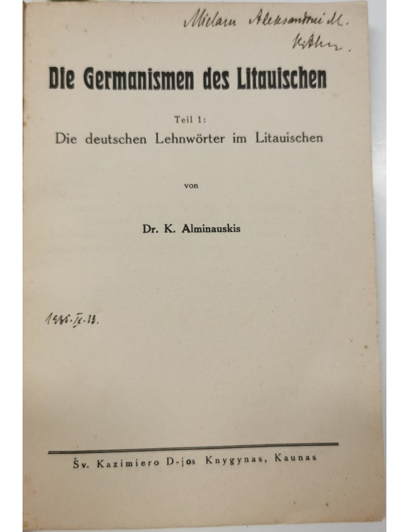 Die Germanismen des Litauischen. K. Alminauskis. Kaunas, 1935. Su autoriaus autografu.