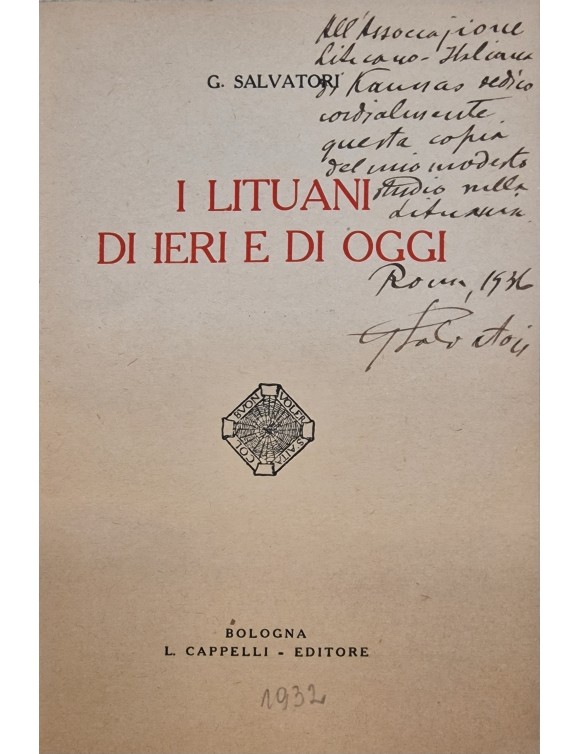I Lituani di ieri e di oggi. G. Salvatori. Bologna, 1932. Su autoriaus autografu.