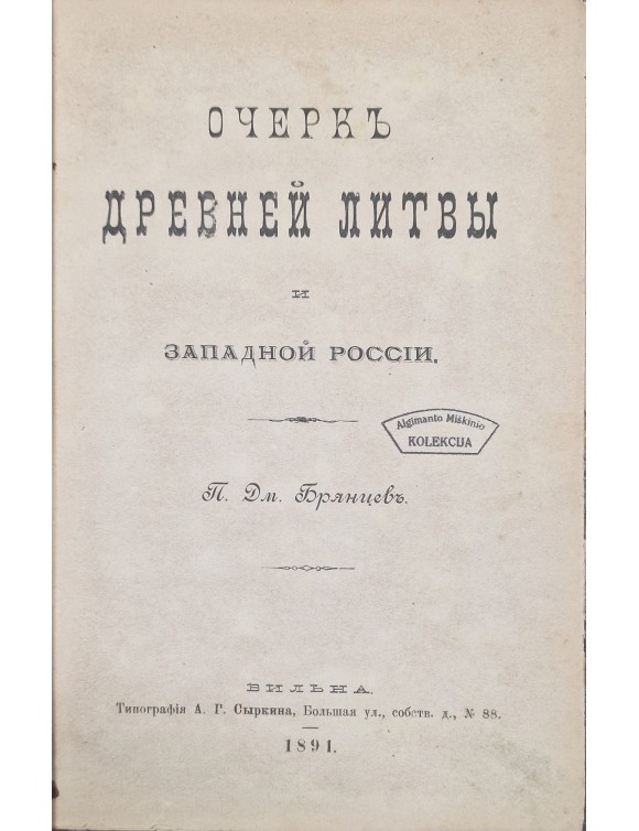 Очеркъ древней Литвы и западной России. Вильна, 1891.