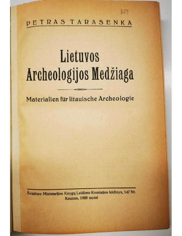Lietuvos archeologijos medžiaga. Petras Tarasenka. Kaunas, 1928. 358 psl.
