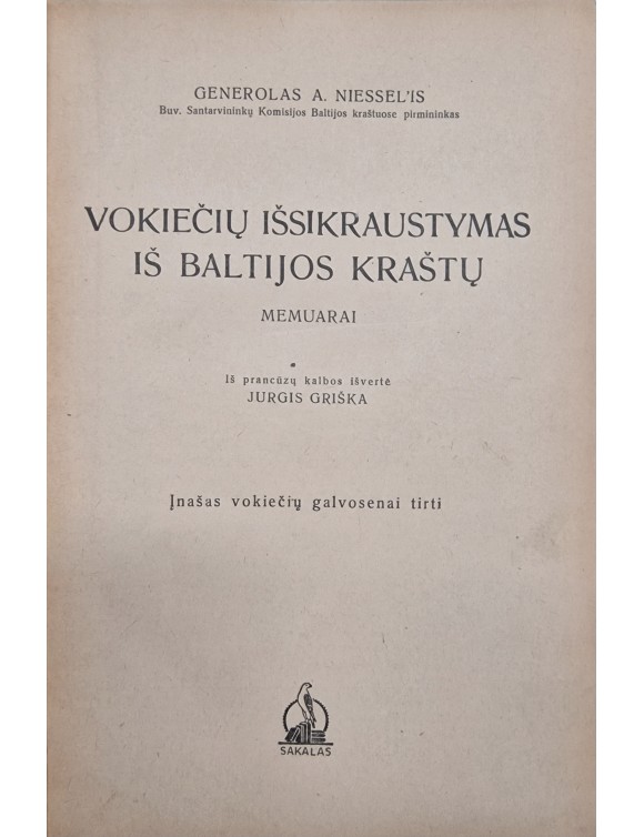 Vokiečių išsikraustymas iš Baltijos kraštų. A. Niessel. Kaunas, 1938.