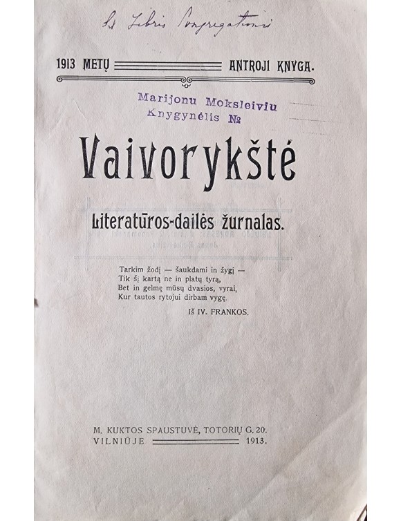 Vaivorykštė. Literatūros- dailės žurnalas. 1913 metų antroji knyga. Vilnius, 1913.