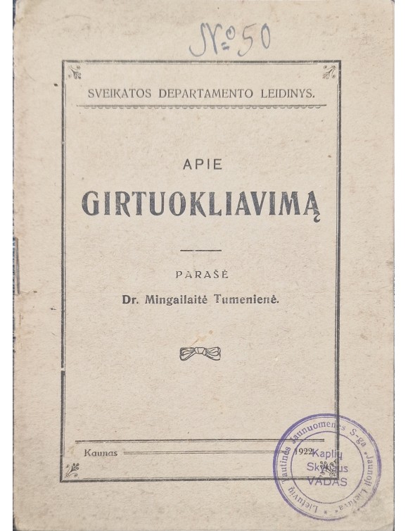 Apie girtuokliavimą. Dr. Mingailaitė Tumėnienė. Kaunas, 1922.