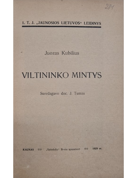 Viltininko mintys. J. Kubilius. Kaunas, 1929.