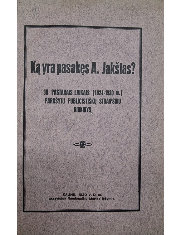 Ką yra pasakęs A. Jakštas? Kaunas, 1930.