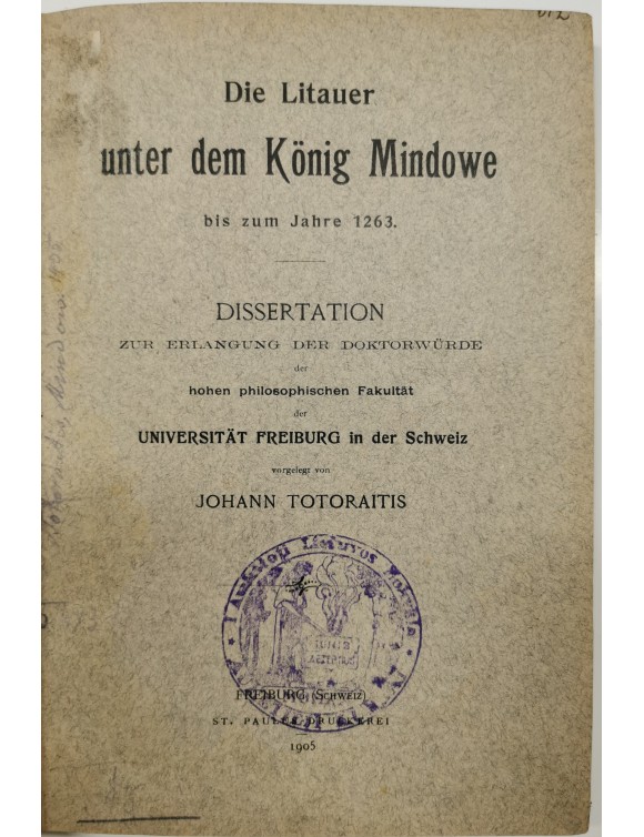 Die Litauer unter dem Konig Mindowe bis zum Jahre 1263. J. Totoraitis. Freiburg, 1905. 160 psl.