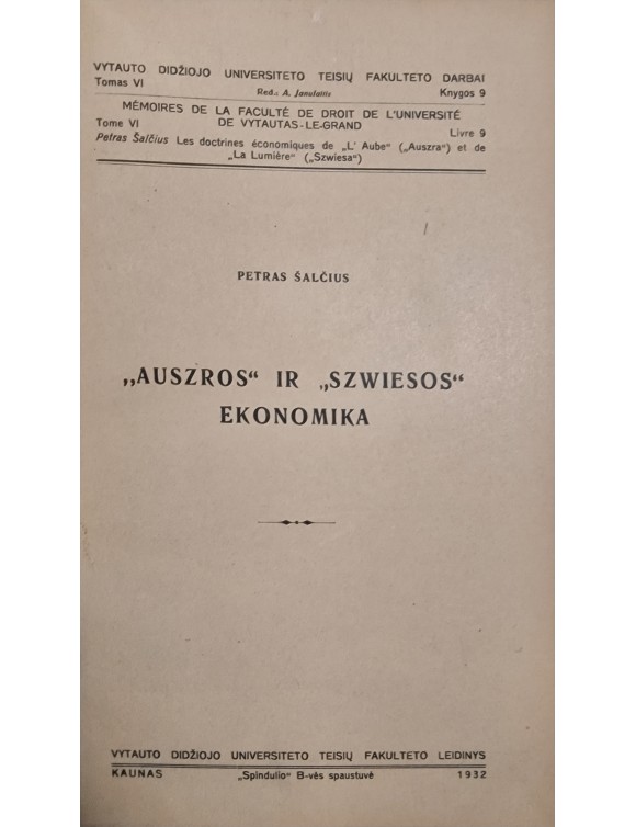"Auszros" ir "Szwiesos" ekonomika. P. Šalčius. Kaunas, 1932.