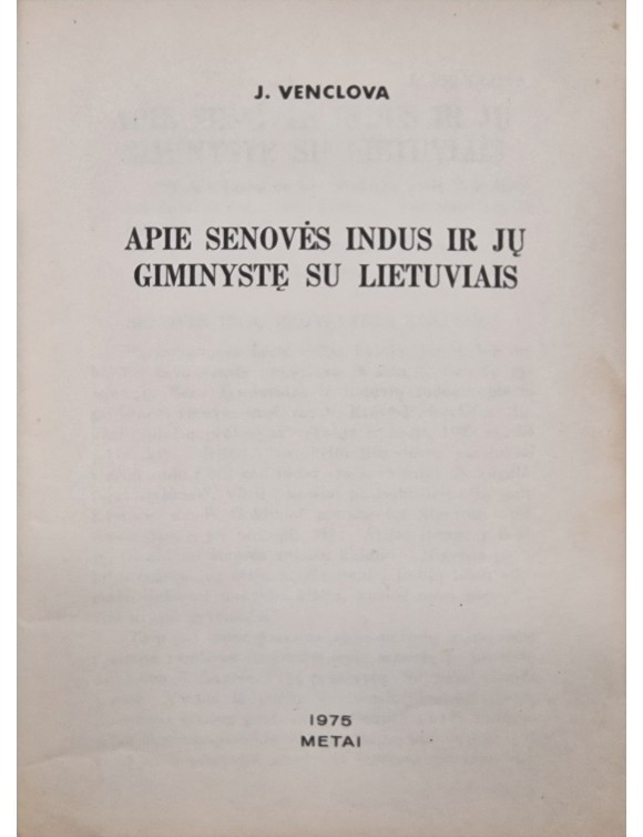 Apie senovės Indus ir jų giminystę su Lietuviais. J. Venclova. 1975 m.