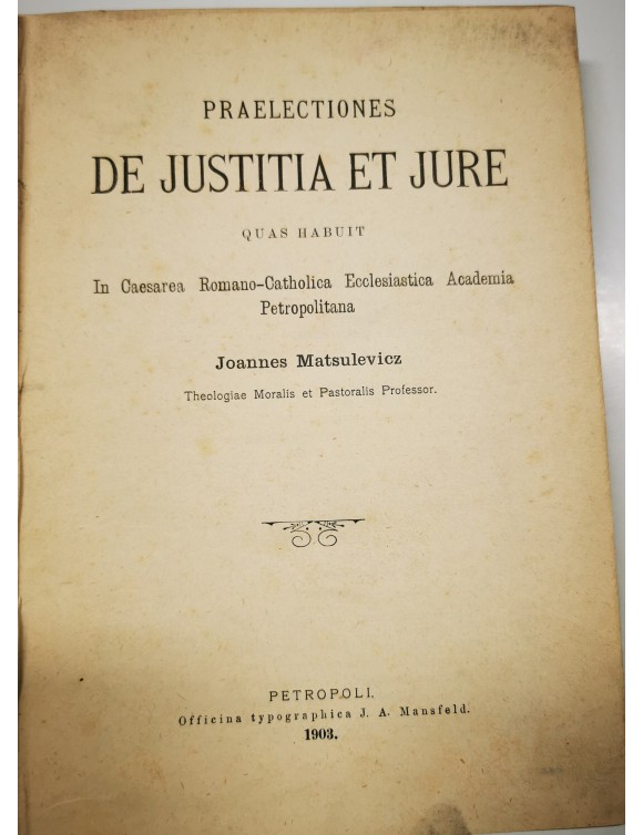 Praelectiones de justitia et jure quas habuit. In Caesarea Romano- Catholica Ecclesiastica Academia Petropolitana. J. Matsulevicz. Petropoli, 1903.  366 psl. K. Šaulio autografas.
