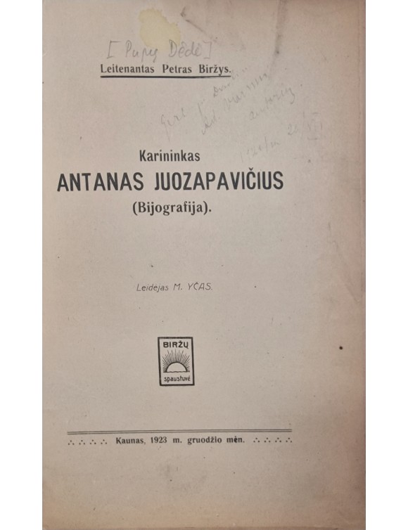 Karininkas Antanas Juozapavičius (Bijografija). Petras Biržys [Pupų Dėdė]. Kaunas, 1923.