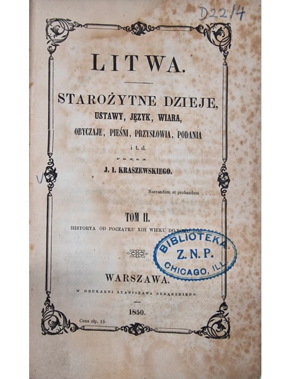 Litwa. Starozytne dzieje, ustawy, język, wiara, obyczaje, piesni, przyslowia, podania i t.d. T.2. J. I. Kraszewski. Warszawa, 1850.
