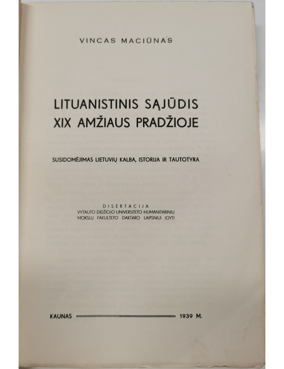 Lituanistinis sąjūdis XIX amžiaus pradžioje. Susidomėjimas lietuvių kalba, istorija ir tautotyra. V. Maciūnas. Kaunas, 1939.