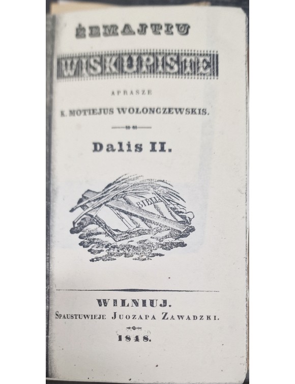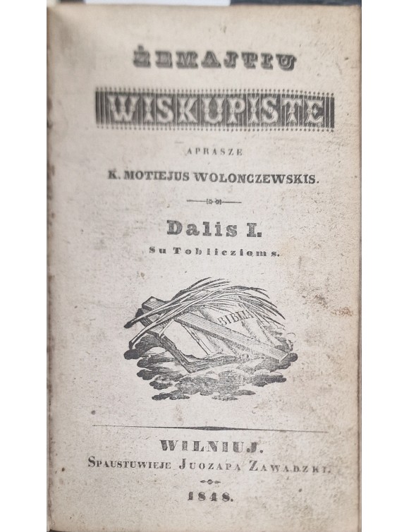 Žemaitjiu wiskupiste. M. Wolonczewskis. T.1-2. Vilnius, 1848.  Antro tomo pirmi du lapai ir T.1 paskutinis lapas kopijuoti. Antras tomas įrištas prieš pirmą tomą.