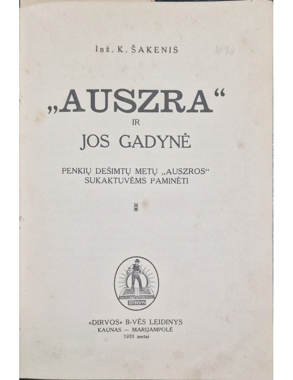 "Auszra ir jos gadynė". Penkių dešimtų metų "Auszros" sukaktuvėms paminėti. Kaunas- Marijampolė, 1933.
