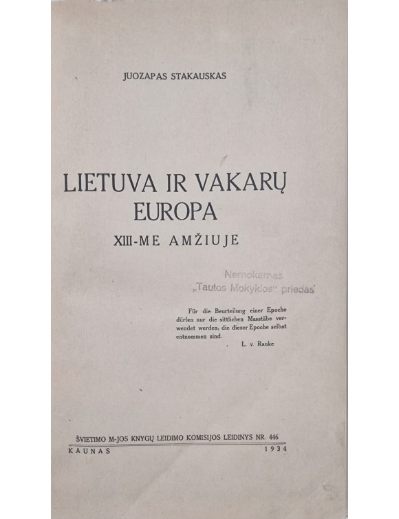 Lietuva ir vakarų Europa XIII-ME amžiuje. Kaunas, 1934. Su 2 žemėlapiais.