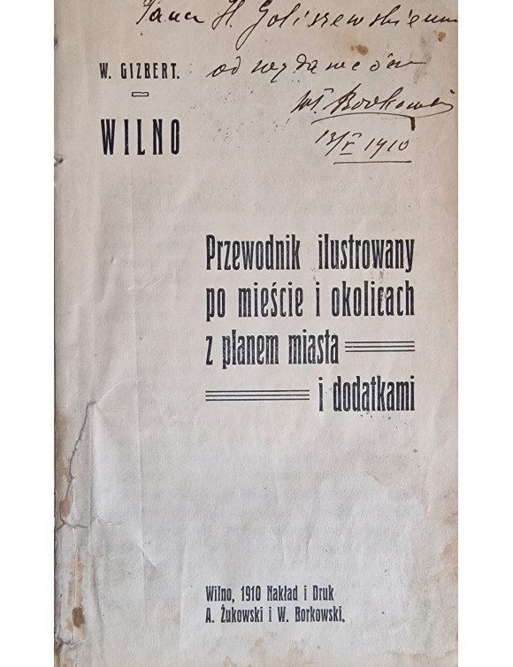 Wilno. Przewodnik ilustrowany po miešcie i okolicach z planem miasta i dodatkami. W. Gizbert- Studnicki. Wilno, 1910. Be žemėlapio, su leidėjo autografu.