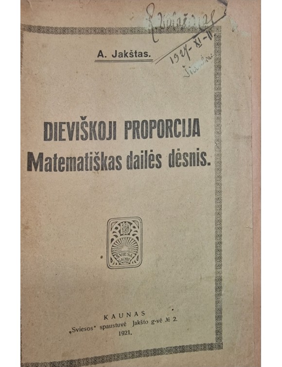 Dieviškoji proporcija. Matematiškas dailės dėsnis. A. Jakštas. Kaunas, 1921.