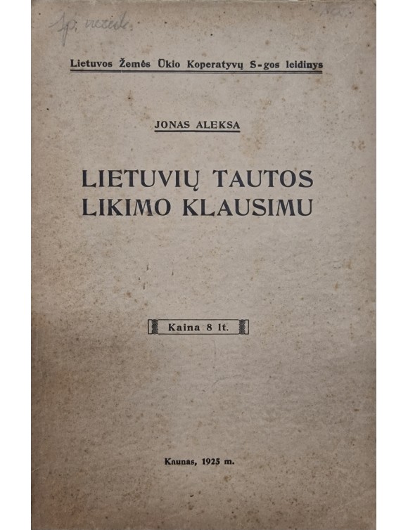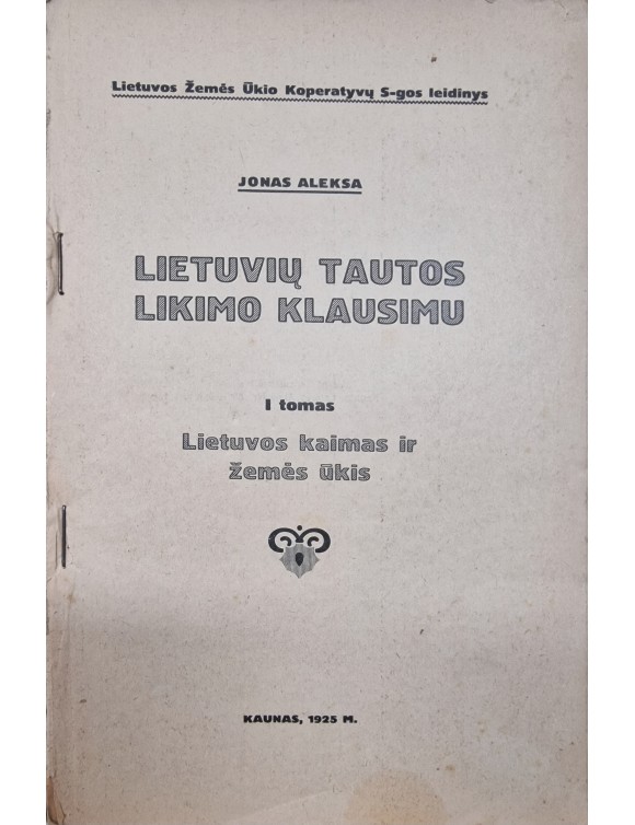 Lietuvių tautos likimo klausimu. J. Aleksa. T.1. Kaunas, 1925.