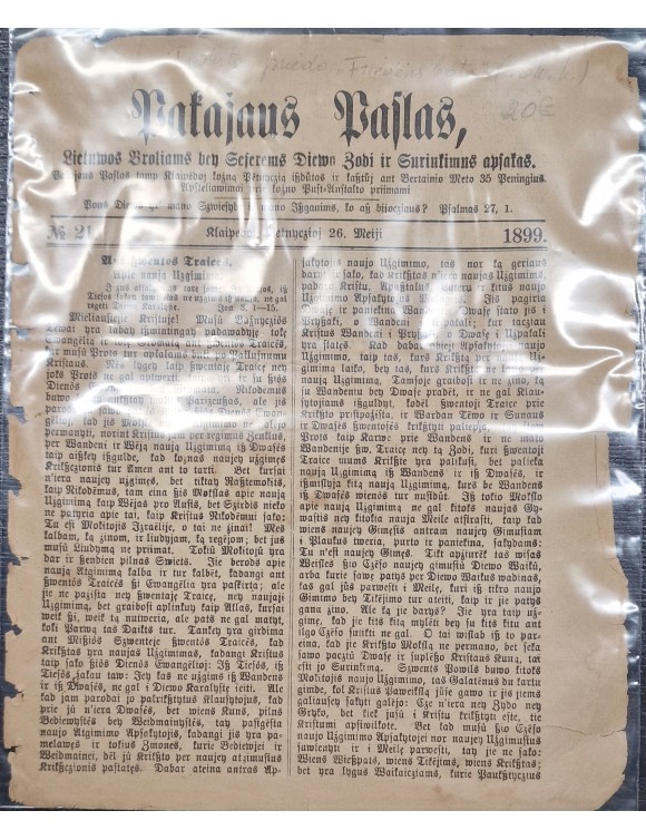 Pakajaus Paslas. 1899, Nr.1. Leistas Klaipėdoje. Trūksta priedo "Friedens bote" (vok.k.)