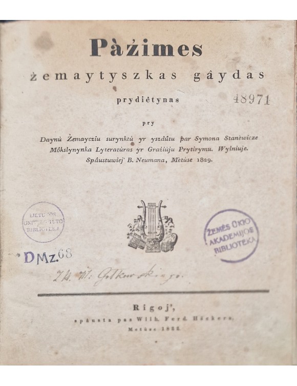 Pažimes žemaytyszkas gaydas prydietynas Daynu Žemaycziu... S. Stanevičius,- Ryga, 1833. 28p., vinjetė.- Trūksta paskutinio lapo.- Galimai tai tik IV egz., žinomas Lietuvoje.