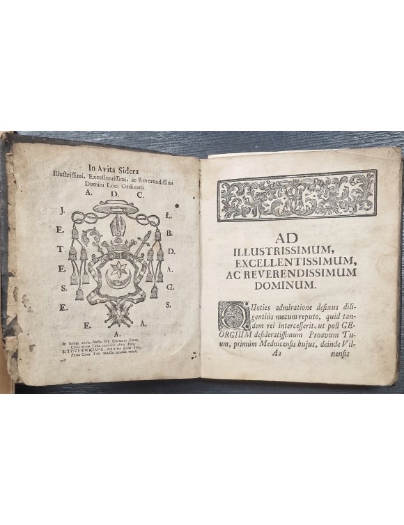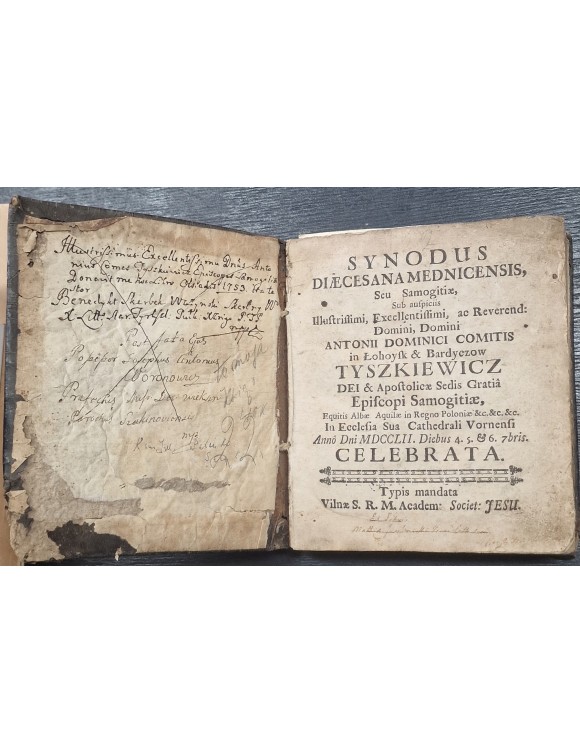 [Žemaičių vyskupystės sinodo nutarimų knyga, priklausiusi LDK iždininkui Benediktui Skarbek-Važynskiui]. Synodus Diaecesana Mednicensis, sub auspiciis Illustrissimi, Excellentissimi, ac Reverend: Domini, Domini Antonii Dominici Comitis in Lohoysk et Bardyczow Tyszkiewicz... Typis mandata Vilnae S. R. M. Academ: Societ: Jesu, 1752. [36] 242, 7] p.: inic., vinj., iliustracija- Tiškevičių herbas. Originialus odinis viršelis.