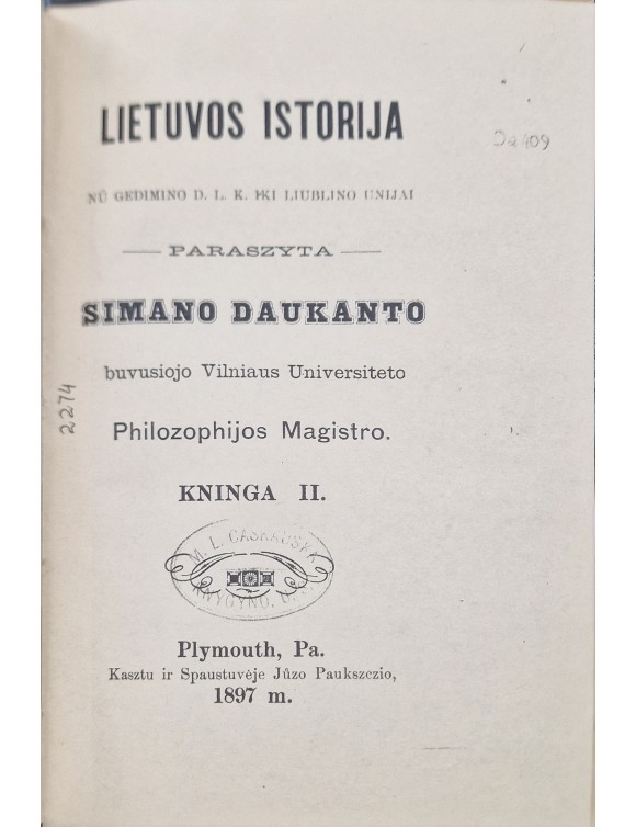 Lietuvos istorija. S. Daukantas. Plymouth, 1897. Naujas įrišimas, titulinis puslapis kopijuotas.